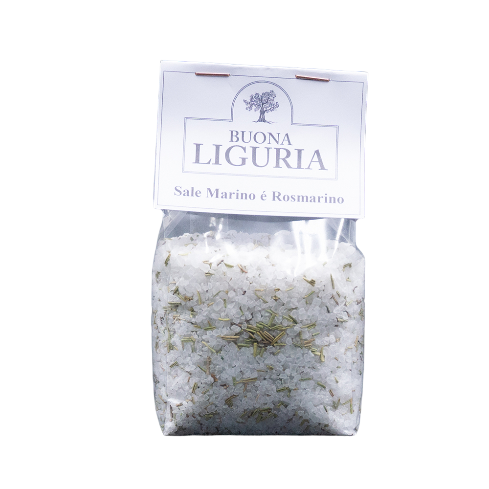 Sale Marino e Rosmarino. Grobes Ital. Meersalz mit Rosmarin. Eignet besonders zum Würzen und Abschmecken von gegrilltem, gebacknem und gedünstetem Fisch. Rosmarinkartoffel aus dem Ofen uvm.